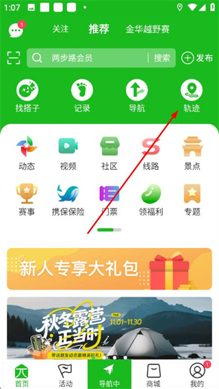 1、打開(kāi)兩步路戶外助手APP,在首頁(yè)點(diǎn)擊軌跡。
