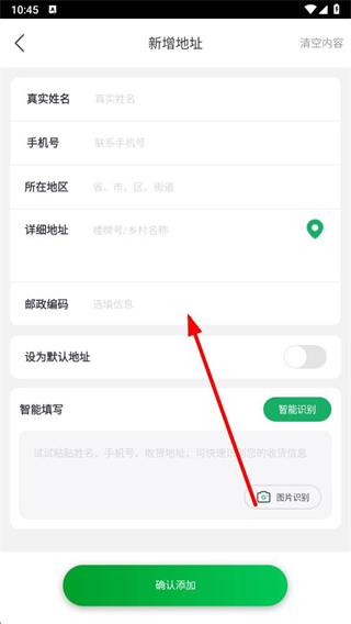 4、在新增地址頁(yè)面,填寫詳細(xì)信息后,點(diǎn)擊確認(rèn)添加即可添加新地址信息。