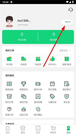 1、打開中國(guó)郵政APP,在我的頁(yè)面點(diǎn)擊編輯資料選項(xiàng)。