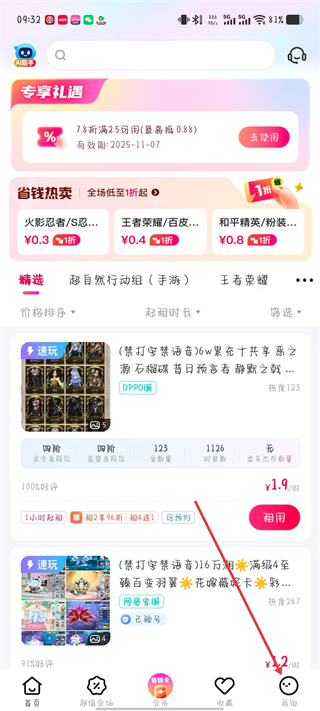 1、打開租號玩應(yīng)用進(jìn)入首頁,瀏覽游戲賬號列表,找到想要收藏的王者榮耀等游戲賬號,點(diǎn)擊進(jìn)入該賬號詳情頁面。