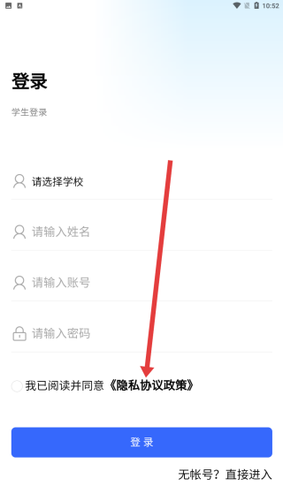 2、在學(xué)生登錄頁(yè)面,找到我已閱讀并同意《隱私協(xié)議政策》選項(xiàng),點(diǎn)擊勾選,滿足登錄的協(xié)議確認(rèn)條件。