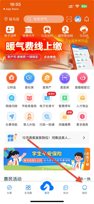 1、打開(kāi)咱的駐馬店app,在首頁(yè)點(diǎn)擊右下角我的選項(xiàng),進(jìn)入個(gè)人頁(yè)面。