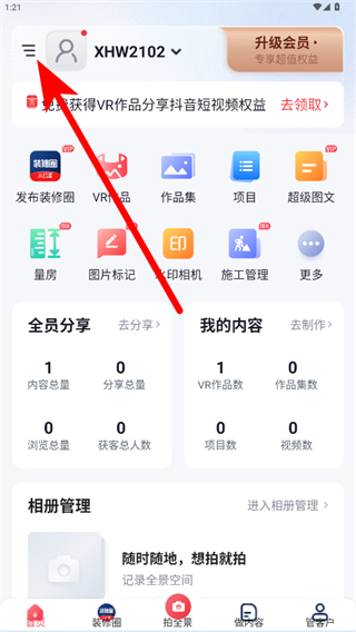 1、打開小紅屋全景相機(jī)APP,點(diǎn)擊首頁左上角三橫線圖標(biāo)。