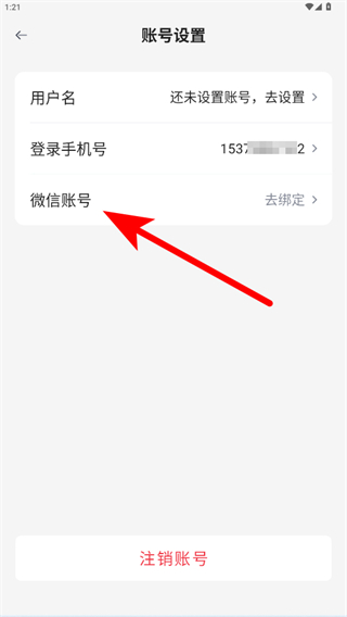 3、在賬號(hào)設(shè)置頁面中找到微信賬號(hào)選項(xiàng),點(diǎn)擊去綁定,按提示完成微信賬號(hào)的綁定操作即可。