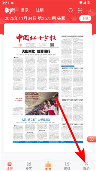 1、在中國紅十字報(bào)讀報(bào)頁面,點(diǎn)擊右下角我的選項(xiàng),進(jìn)入個(gè)人界面。