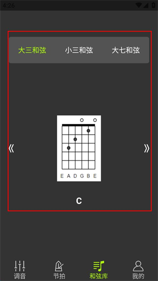 4、進(jìn)入和弦?guī)旖缑?,查看大三和弦下的C和弦指法圖。