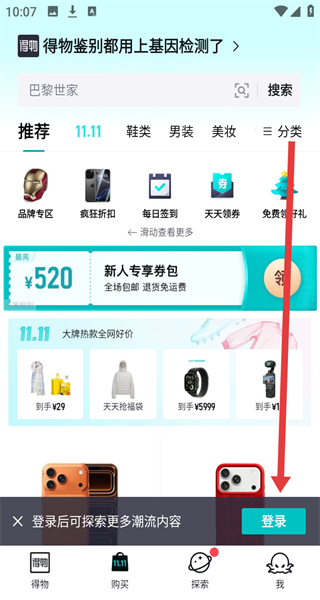 1、在進(jìn)入到得物首頁時,可以點擊下方登錄按鈕,進(jìn)行登錄操作。