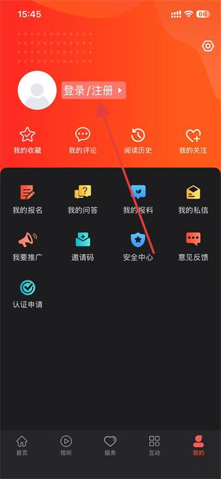 2、在我的頁面,找到并點(diǎn)擊上方登錄/注冊(cè)按鈕。