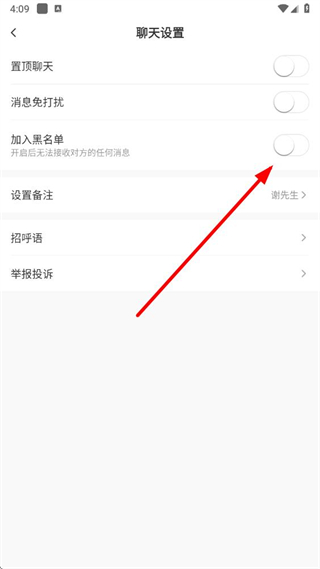 4、在聊天設(shè)置頁面,找到加入黑名單選項,點擊其右側(cè)的開關(guān)按鈕即可將對方拉黑。
