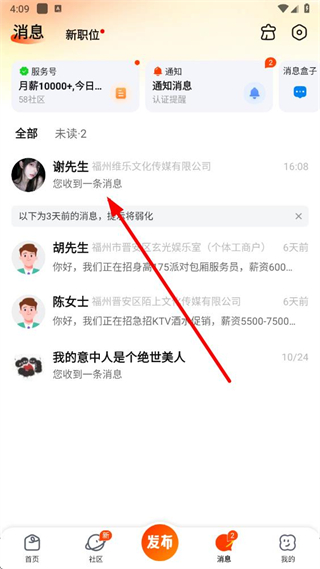 2、在消息頁面,點擊要拉黑的聯(lián)系人進(jìn)入聊天界面。