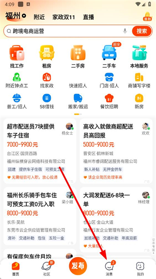 1、在58同城首頁,點擊底部消息進(jìn)入消息頁面。