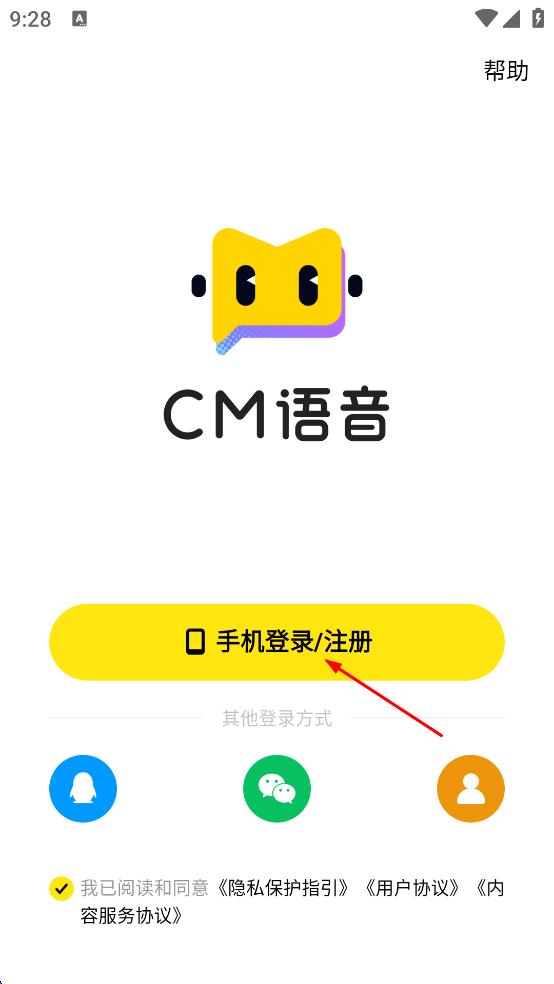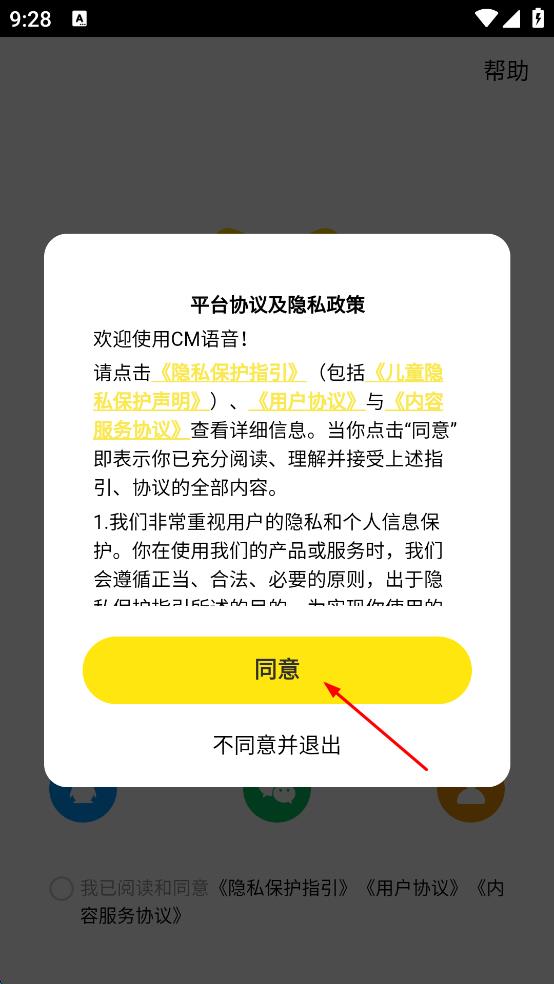 1、打開CM語音APP,在彈出的平臺協(xié)議及隱私政策頁面,點擊“同意”按鈕,進入APP登錄界面。