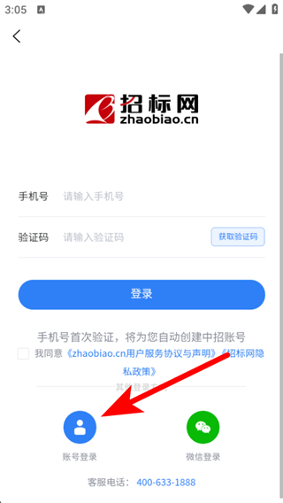 3、在登錄界面,點(diǎn)擊賬號(hào)登錄的按鈕,進(jìn)入賬號(hào)密碼登錄頁(yè)面。