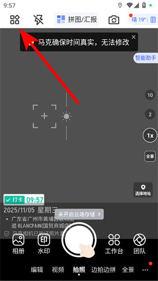 1、打開馬克水印相機(jī),點(diǎn)擊界面上方的拼圖/匯報(bào)選項(xiàng)。