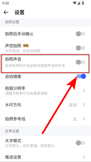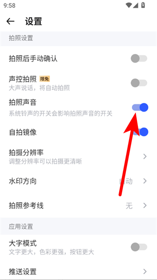 4、將其開關(guān)開啟,即可打開馬克水印相機(jī)的拍照聲音。