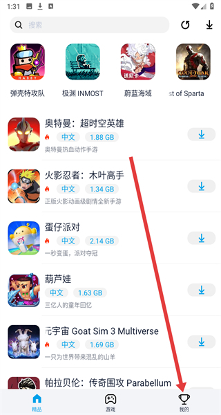 1.首先我們點擊軟件進入軟件主頁,在精品頁面中可以看到一些比較優(yōu)質(zhì)的游戲推薦,往下滑還能發(fā)現(xiàn)更多的游戲資源,看到喜歡的可以點擊右側(cè)的”↓“符號下載;