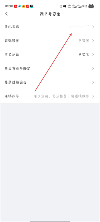 3、進入賬戶與安全頁面后,點擊手機號碼選項。