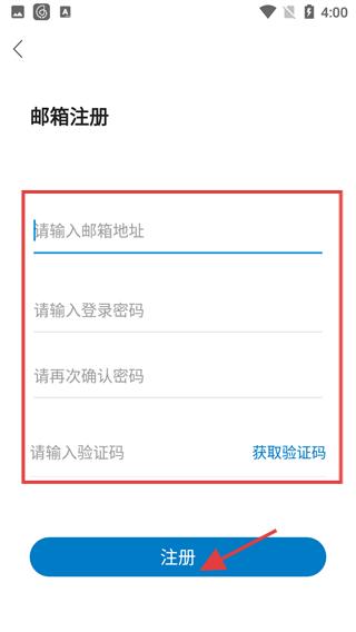 3、輸入郵箱地址、登錄密碼、驗(yàn)證碼,點(diǎn)擊注冊(cè),即可完成賬號(hào)注冊(cè)。