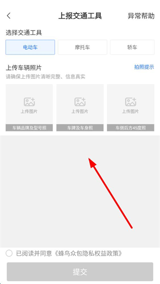 4、在頁面,選擇交通工具類型,上傳車輛照片,勾選同意相關(guān)政策后點擊提交即可完成上報。