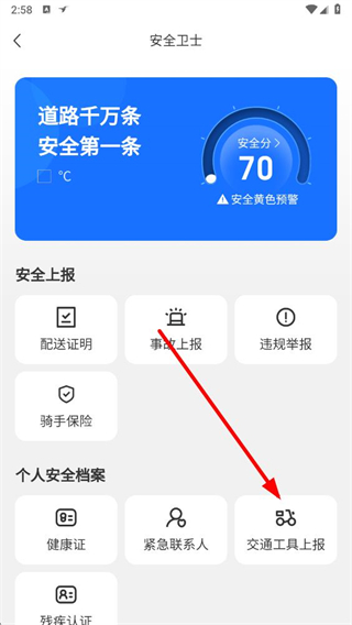 3、進入安全衛(wèi)士頁面后,點擊交通工具上報選項。