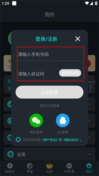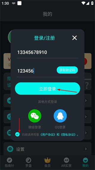 3、輸入手機(jī)號(hào)碼,獲取并輸入驗(yàn)證碼,勾選同意用戶協(xié)議和隱私協(xié)議。