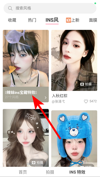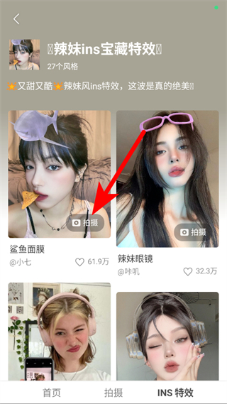 1、打開(kāi)甜鹽相機(jī)APP,點(diǎn)擊右下角INS特效,進(jìn)入特效選擇頁(yè)面。