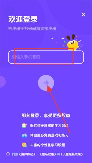 3、在歡迎登錄頁面,輸入手機(jī)號,點(diǎn)擊箭頭按鈕。