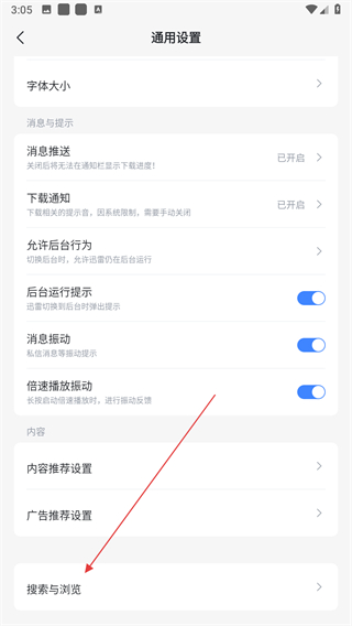 3、在通用設(shè)置頁面,點(diǎn)擊搜索與瀏覽。