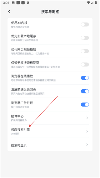 4、在搜索與瀏覽頁面,點(diǎn)擊修改搜索引擎。