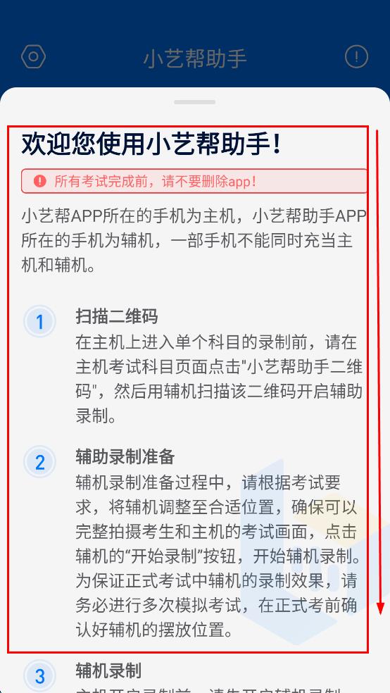 小藝幫app的輔助錄制工具,幫助考生在考試中實(shí)現(xiàn)多機(jī)位考試場(chǎng)景錄制。小藝幫助手掃描主機(jī)二維碼進(jìn)入考試輔助錄制,考試完成后提交輔助視頻。