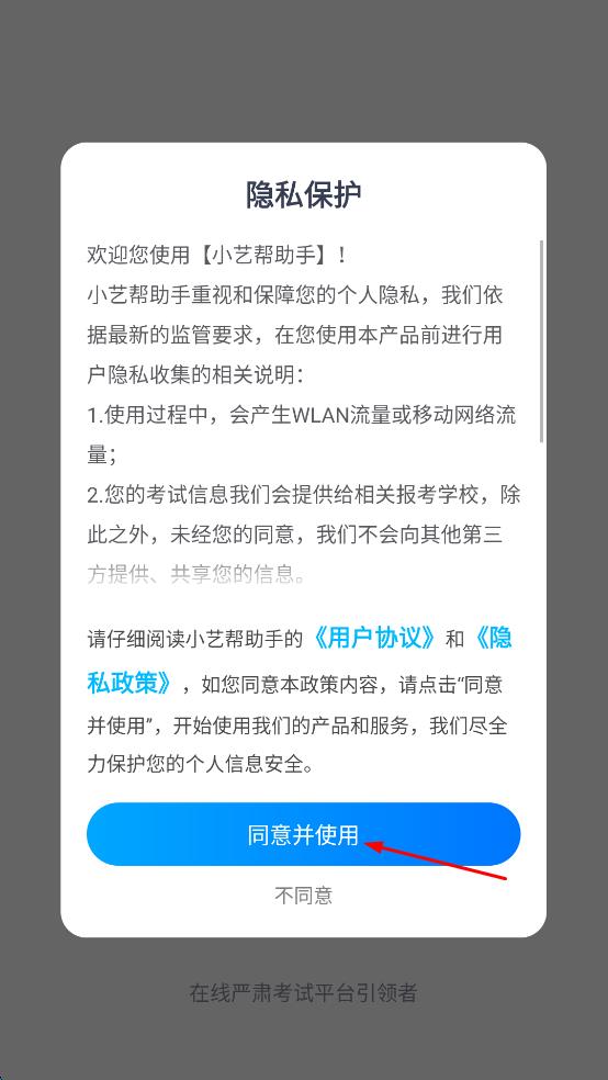 1、打開小藝幫助手APP,會(huì)彈出隱私保護(hù)頁(yè)面,仔細(xì)查看內(nèi)容后,點(diǎn)擊“同意并使用”按鈕,進(jìn)入APP主界面。