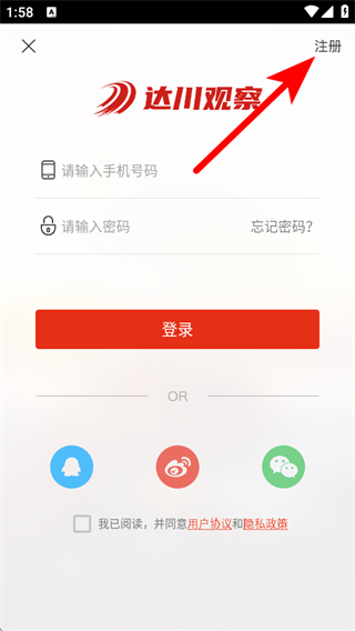 3、在登錄的頁(yè)面,需要點(diǎn)擊右上角注冊(cè),進(jìn)入手機(jī)注冊(cè)頁(yè)面。