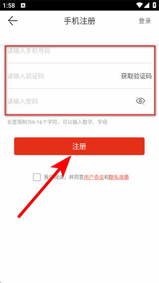 4、依次輸入手機(jī)號(hào)碼等信息,點(diǎn)擊注冊(cè),注冊(cè)后即可登錄。