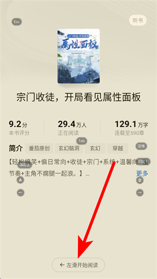 2、在作品詳情頁面,點擊左滑開始閱讀按鈕,進入小說閱讀界面。