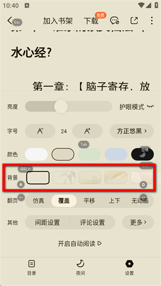 4、在閱讀設(shè)置界面,點擊背景區(qū)域的顏色選項,即可完成背景顏色修改操作。