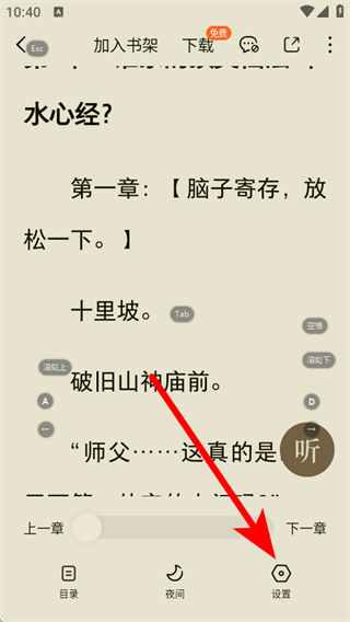 3、在小說閱讀界面,點擊屏幕呼出操作欄,點擊設(shè)置選項,進入閱讀設(shè)置界面。