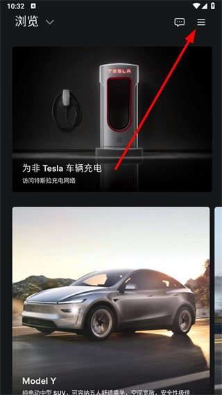 1、打開特斯拉app,在瀏覽界面點擊右上角三條橫線圖標(biāo)進入菜單。