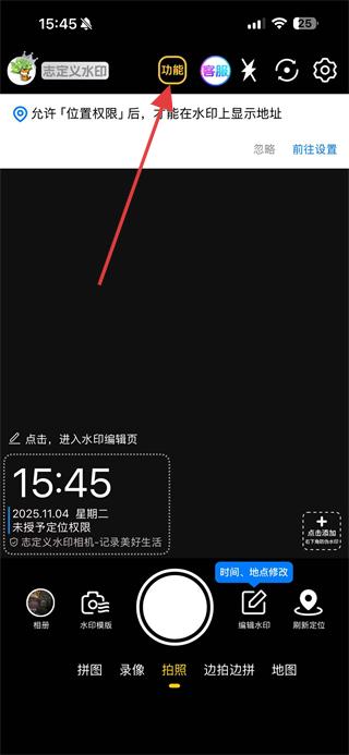 1、打開(kāi)自定義水印相機(jī)APP,點(diǎn)擊上方功能按鈕,進(jìn)入功能選擇頁(yè)面。
