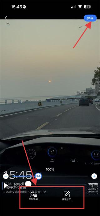 4、視頻選擇后,可在下方調(diào)整水印大小、選擇水印模板、編輯水印等,完成后點(diǎn)擊右上角保存,即可給視頻添加水印。