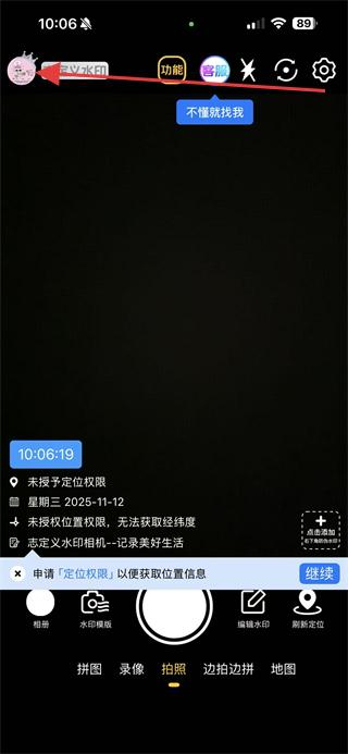 1、打開(kāi)自定義水印相機(jī)應(yīng)用,點(diǎn)擊左上角的頭像進(jìn)入個(gè)人中心。