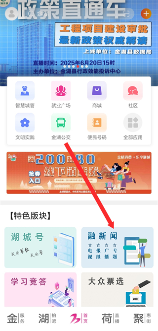 1、打開金湖發(fā)布APP,找到并點(diǎn)擊融新聞板塊,進(jìn)入新聞頁面。