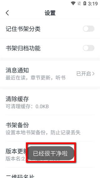 3、在設(shè)置頁面,點(diǎn)擊清除緩存選項(xiàng),即可清除全免小說的緩存。