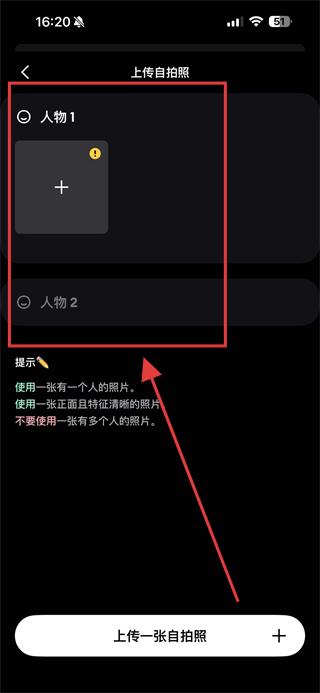 2、在上傳自拍照界面,分別為人物1和人物2上傳對應(yīng)的自拍照。