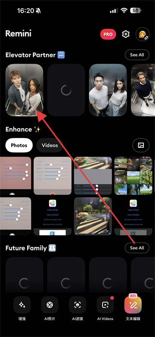 1、打開Remini應(yīng)用,點(diǎn)擊Elevator Partner板塊中的模板進(jìn)入編輯流程。