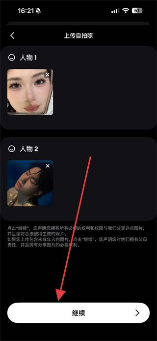 3、兩張自拍照上傳完成后,點(diǎn)擊界面底部的繼續(xù)按鈕,等待應(yīng)用生成效果。