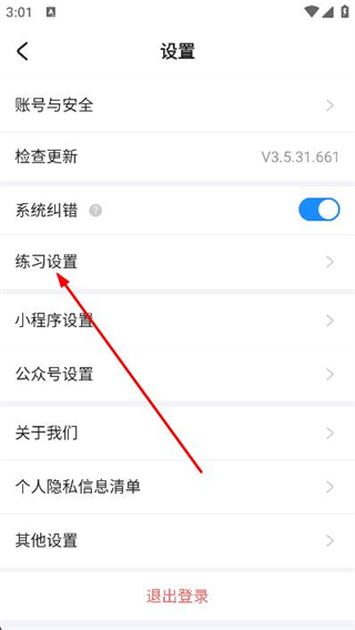 3、進(jìn)入設(shè)置頁面后,找到并點(diǎn)擊練習(xí)設(shè)置選項。