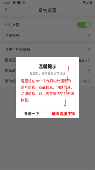 4、在溫馨提示窗口中,點擊聯(lián)系客服注銷,隨后按照客服要求即可。
