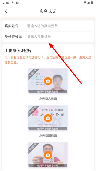 3、在實(shí)名認(rèn)證頁(yè)面,輸入真實(shí)姓名、身份證號(hào)碼,上傳身份證人像面、國(guó)徽面及手持身份證照片,完成提交即可。
