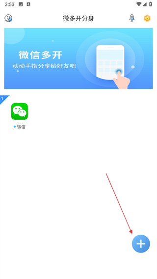 1、打開微多開分身應(yīng)用,點(diǎn)擊右下角的+號(hào)按鈕,進(jìn)入添加應(yīng)用的頁(yè)面。