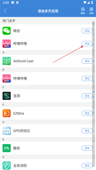 2、在添加多開應(yīng)用頁(yè)面,找到需要多開的應(yīng)用,點(diǎn)擊其右側(cè)的添加按鈕。